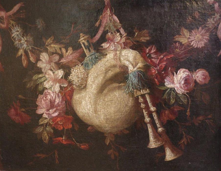 Nature morte aux fleurs et à la cornemuse fin 18ème. Huile sur toile dans un cadre en bois à patine dorée.